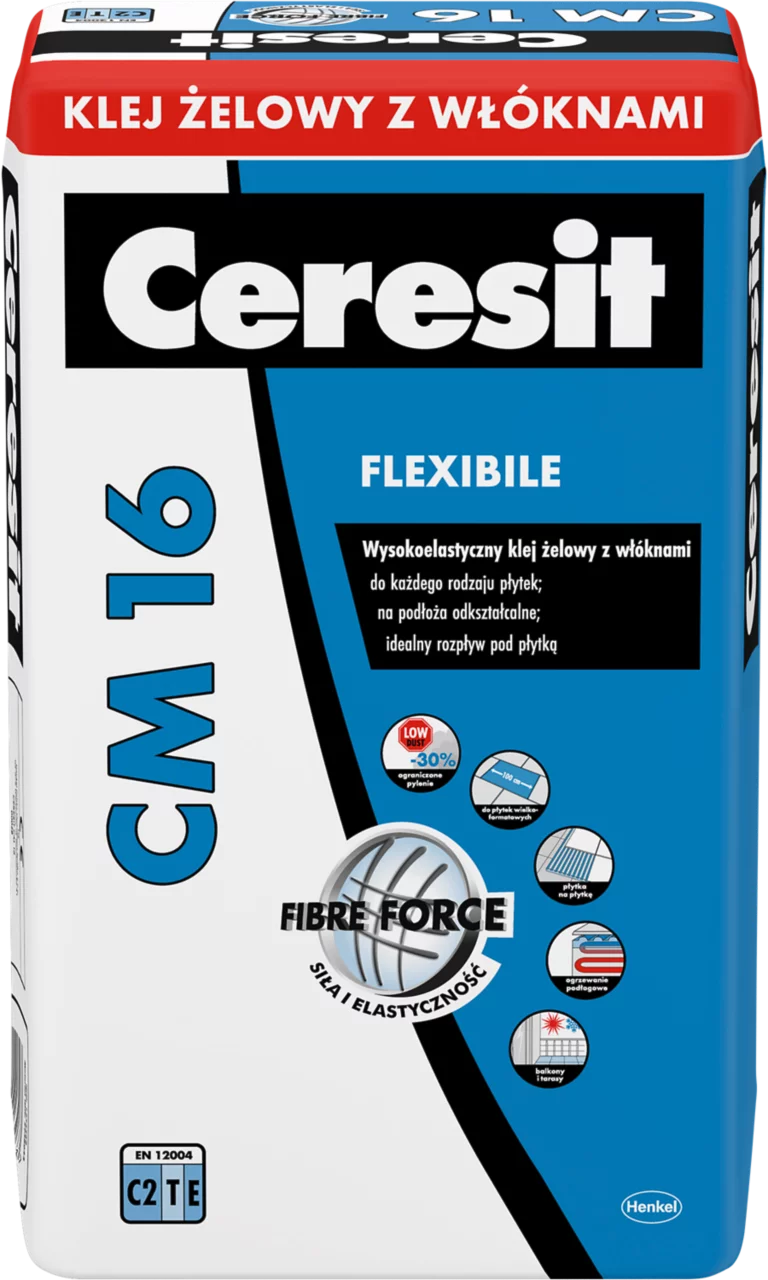 Klej żelowy do płytek z włóknami CERESIT® CM 16 służy do mocowania płytek ceramicznych (glazura, terakota, gres), cementowych oraz z kamienia naturalnego (niewrażliwego na przebarwienia) na podłożach odkształcalnych. Umożliwia klejenie płytek wielkoformatowych (100x100cm).
