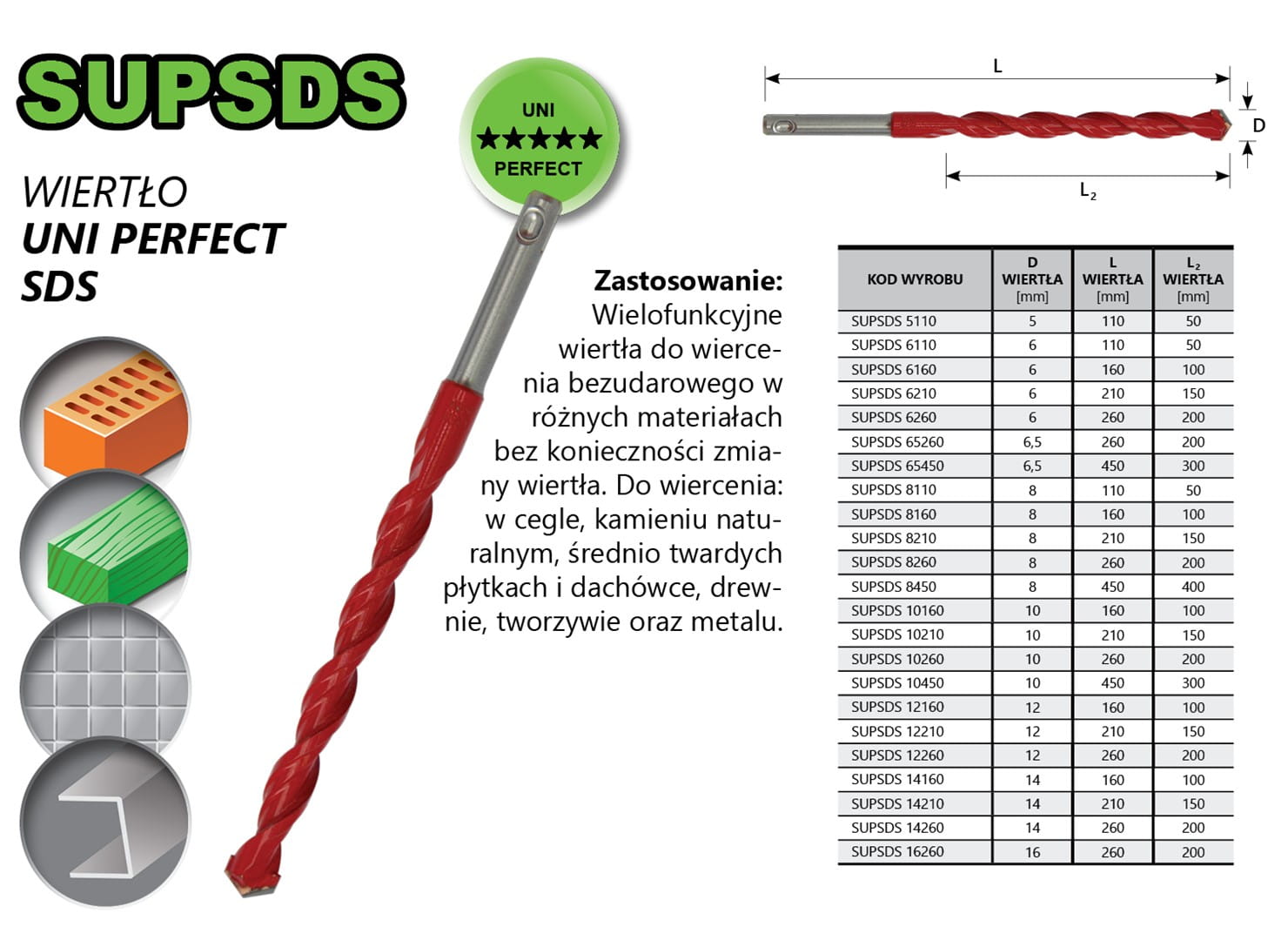 Do wiercenia: w cegle, kamieniu naturalnym, średnio twardych płytkach i dachówce, drewnie, tworzywie oraz metalu.