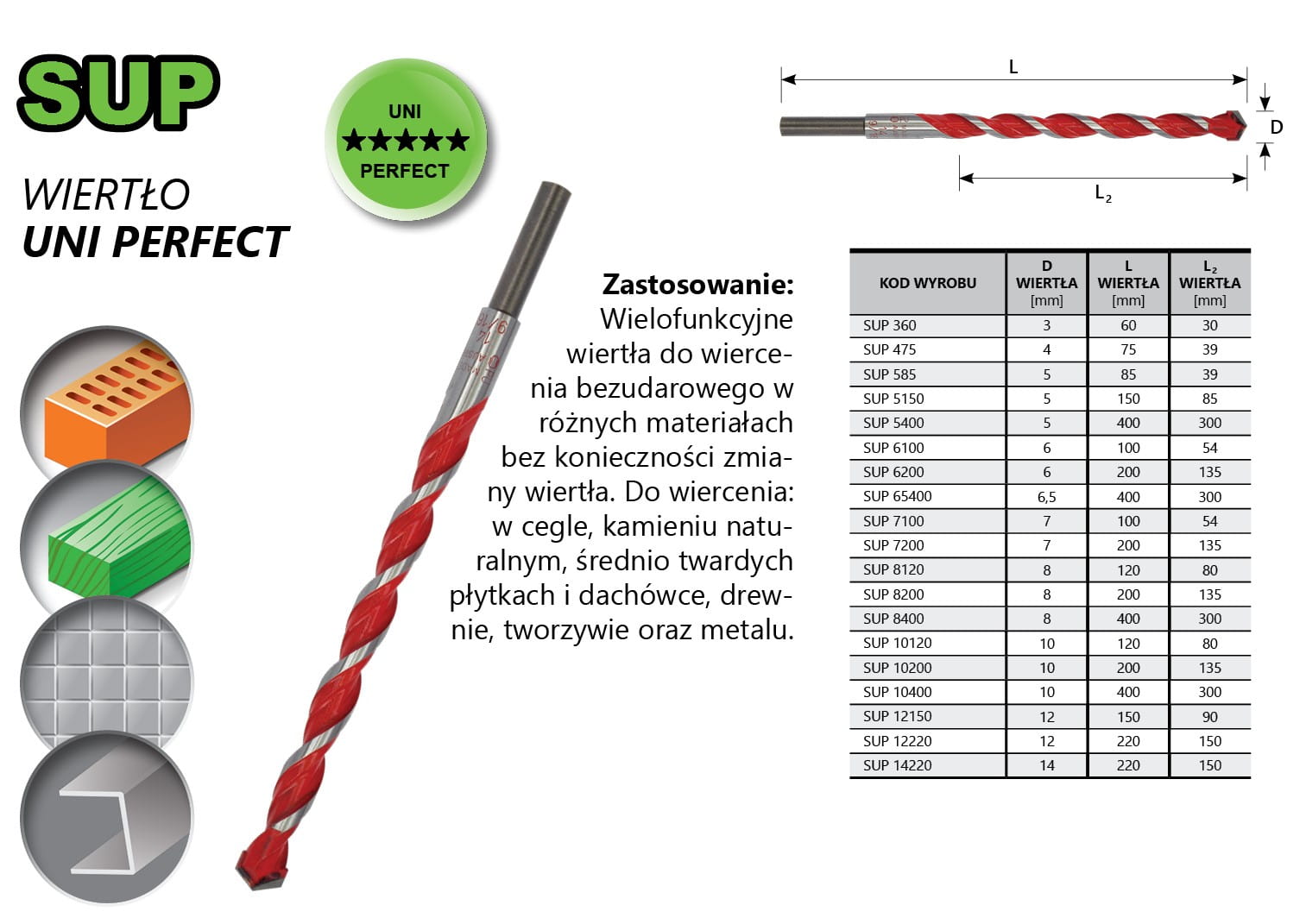 Do wiercenia: w cegle, kamieniu naturalnym, średnio twardych płytkach i dachówce, drewnie, tworzywie oraz metalu.